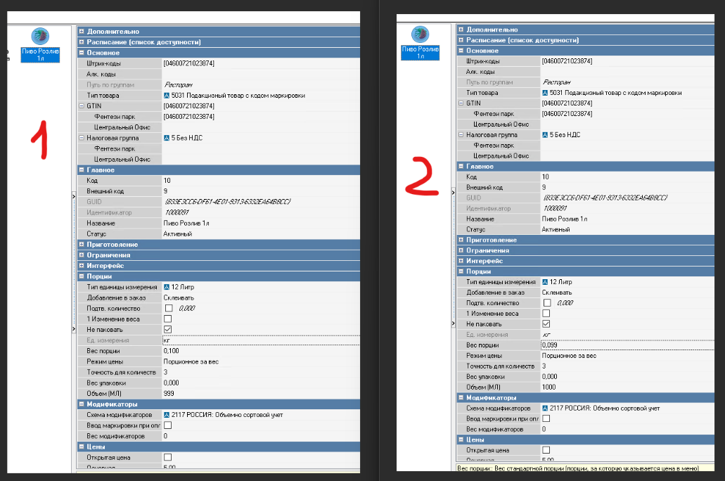Для Абонемента требуется, чтобы объем литров в переданном из RK чеке не был целочисленным (1, 2 и т.д),иначе этот товар будет учтен как штучный, а не объемно-сортовой и в ЧЗ не будет передан объем израсходованного пива. Поэтому, чтобы избежать продажи целого литра например при продаже 2 х 0.5 л, требуется, чтобы настройки в карточке товара в RK были именно такие:
